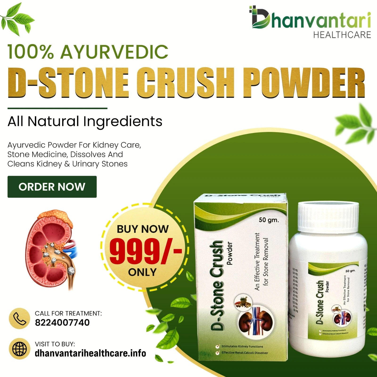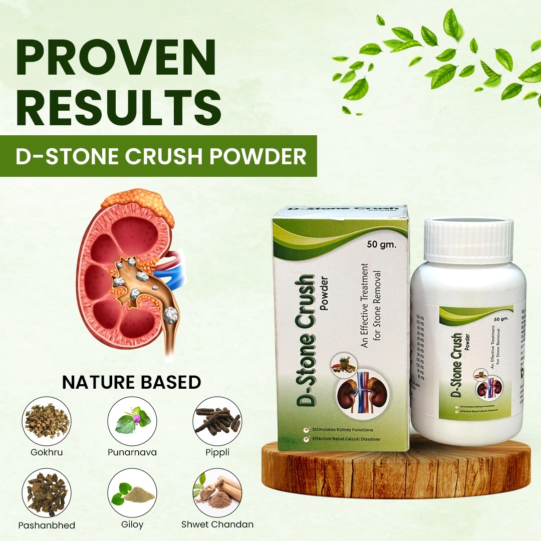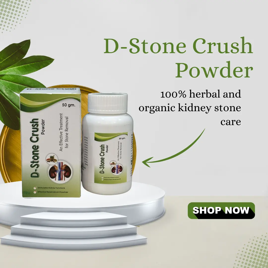 D-Stone Crush Powder is a natural Ayurvedic remedy designed to dissolve kidney stones and promote kidney health without the need for surgery.